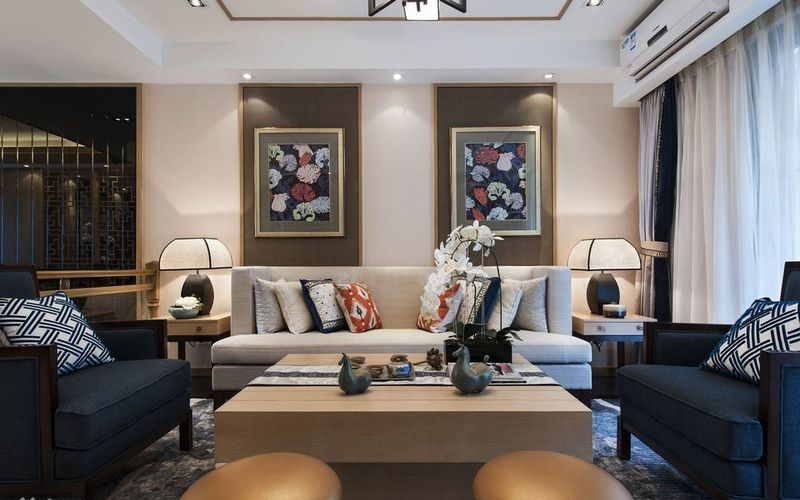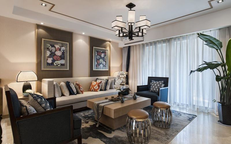 新中式客厅布置搭配摒弃了古代中堂庄重肃穆的原则,而更加人性化,舒适。