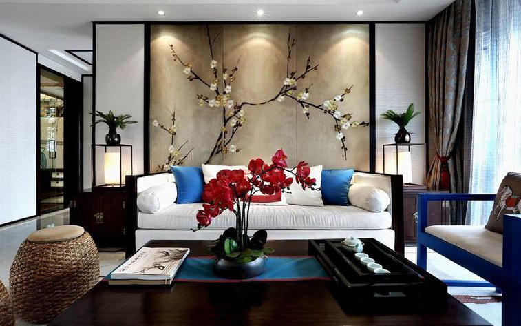 除去顶棚及地面,新中式装修客厅的墙面色彩的设计也是十分关键的部分。墙面的色彩有着定位家居风格、烘托客厅气氛的作用。