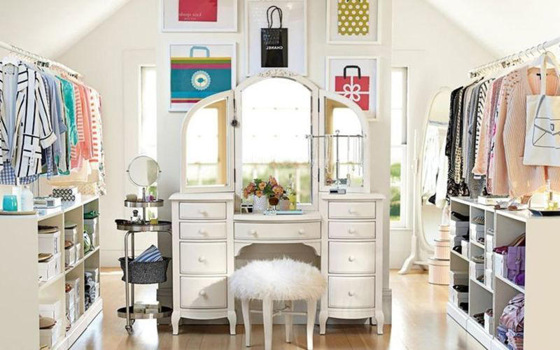 【衣帽间软装设计】白色梳妆台靠墙而立,不仅为整个衣帽间带来了复古的气息,同时还在视觉上扩大了房屋的面积。