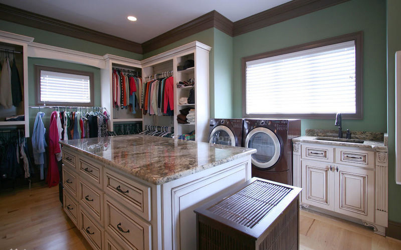 【衣帽间软装设计】对于衣帽间的设计,我们不仅要考虑陈列,还要考虑衣服的清洗等多种功能,比如,这间衣帽间,设计师把储物和洗漱结合起来,节约了空间,而且平时穿脏的衣服直接丢进洗衣机又很方便。