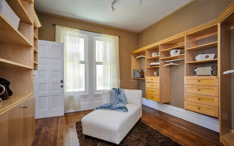 【衣帽间软装设计】这个衣帽间风格上采纳高贵的欧式风格,特制的白色壁柜、奢华的欧式软凳,让整个空间富丽堂皇。