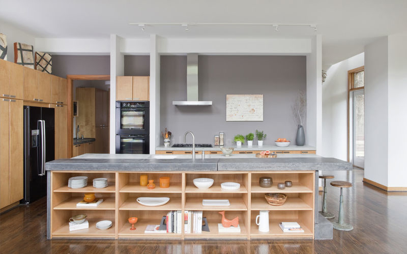 这个大部分取决于你的厨房布局结构。如果你厨房的其他地方有充足的橱柜空间,那么岛台可以少设计一些储物空间,如果岛台是你的主要备膳区域,那么你需要在岛台上安装一个洗碗池,砧板、电器等也会用到,而且,要为备膳用的厨具腾出一点储物空间。
