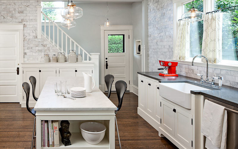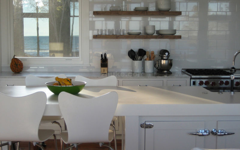 如果你不想让椅子妨碍你烹饪,可以打破传统的相对摆放的布局,像图中这样摆放餐椅,这样就不用担心椅子会耽误你的烹饪过程了。