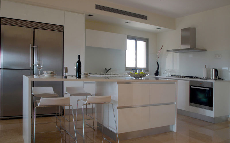 在一间比较现代化的厨房里,也可以用一款混合式岛台来代替纯岛台,图中这款立板式岛台尤其为厨房增添了时尚现代的感觉。