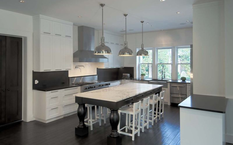 这款餐桌样式的岛台因为有大理石台面,所以更像是一个岛台,而不像餐桌。高脚凳有一个小靠背,看上去颇有椅子的风范。小贴士:如果想营造一种餐厅的氛围,最好使用一款枝形吊灯,而非普通的吊灯。