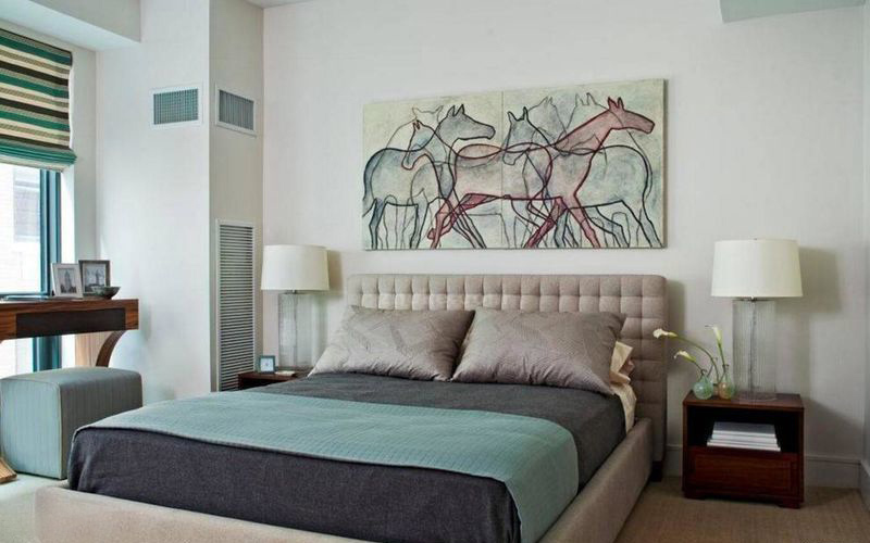 经典的灰色床单突出其简约的银色抱枕,简洁的背景让装饰画中的马更加威风。如果你的床上用品色彩比较素雅,那么你可以选择用装饰画来烘托气氛。