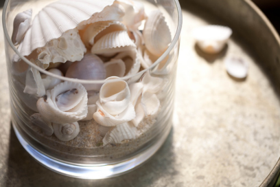 在夏天这个季节开始的时候,就用沙子填充一个大玻璃圆柱形花瓶,并逐渐在里面添加各种各样的贝壳,你将会发现它们在你别墅中,整个夏天中都会带来沙滩的感觉,像置身于海边一样舒适。