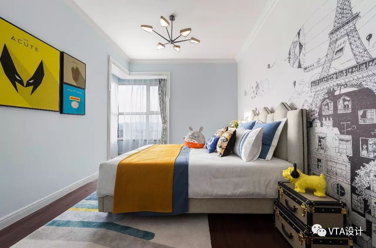 儿童房是孩子的卧室、起居室和游戏空间,在他们成长的时间里,这里是他们的城堡,是他们无忧无虑玩耍的象牙塔。孩子的想象力最为丰富,他们会自己想象这里是什么,那里是什么。房间尽可能的多使用明亮、轻松的色彩,让孩子有丰富的想象空间。