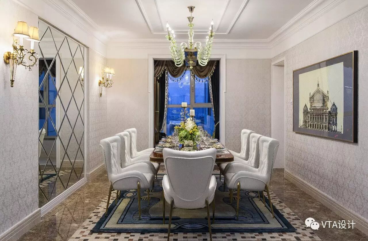 在设计上,墙面大面积的使用了古典欧式色彩的壁纸配,使欧式不再是遥远的过去,而是鲜活时尚的品味象征。减掉了复杂的欧式护墙板使用了提炼过的石膏线勾勒出线框,把墙板的形式简化到极致。