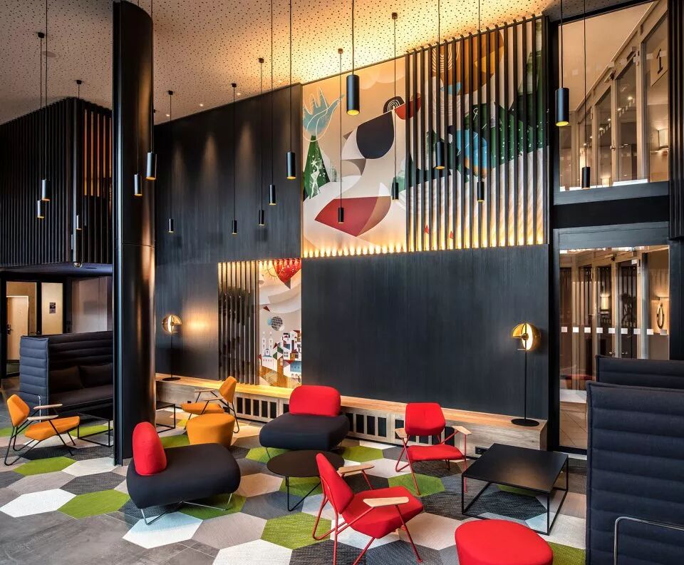 酒店大堂的重新设计旨在为客人们提供实用、优美且难忘的社交场所和入住空间,带来家一般的氛围。中央的社交空间摆放着舒适的扶手椅、高背沙发和咖啡桌,可用于创意性的合作办公和集体会议。连贯的空间体验与令人影响深刻的观感使客人们流连其间,促成进一步的交流与沟通。大堂的墙壁和二层的窗户使用了相同的板条系统,垂直的分隔元素使二层空间变得形象化,同时带来下方空间的视野。深灰色的木质饰面和灰色的水泥地砖呼应了瑞士的极简设计风格,同时与鲜艳的家具和定制壁画形成相宜的对比。