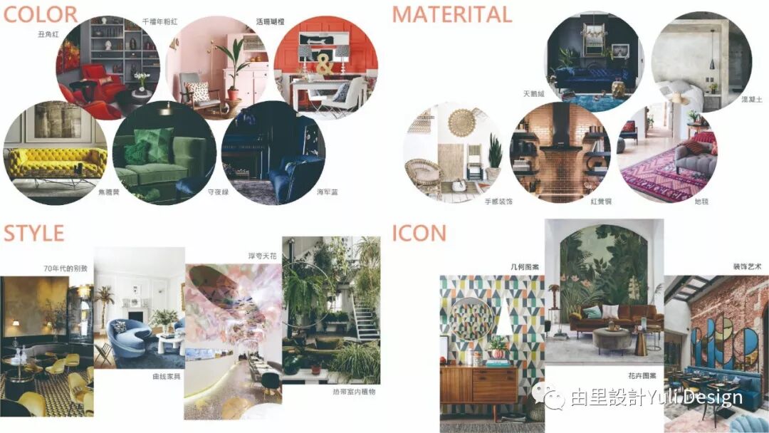 傅總監觀察今年各大時尚秀,彙整了2019年M&O 巴黎設計展將今年的軟裝設計流行趨勢分成「 顏色、質地、風格、元素 」四大類別,並以設計作品作相對的輔佐說明趨勢展現的手法。其中,70年代的風格的回歸,大膽用色、浮誇風格、百變繽紛的室內軟裝呈現。