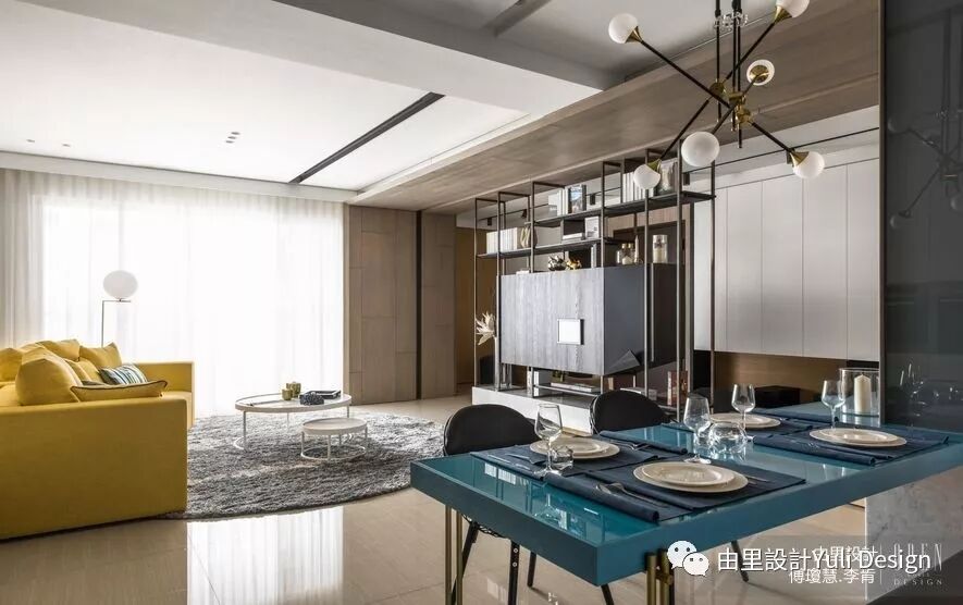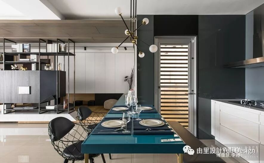 同樣的主題色手法,來到餐廚區則轉變為遼闊的海洋意象,在黑白與灰藍天地環繞下,此區域的重點物件——「餐桌」,延展亮麗的藍綠色系,搭配簡約的鍍鈦桌腳,散發出簡單卻令人倍感舒爽的美感樣式。圍聚一側的餐椅結合藤編座椅意象,碗型弧度設計引人沉坐其中,與家人在此忘卻時間的叨擾,靜靜享受一同聚餐暢談的美好時光。而這份閒散亦向多功能區域延伸,一體成型的客製化長桌化為置物平台,從擺放佳餚到陳列藝術物件,只消給予一個檯面便能一次滿足,著實將生活的細膩考量極度到位地呈現。