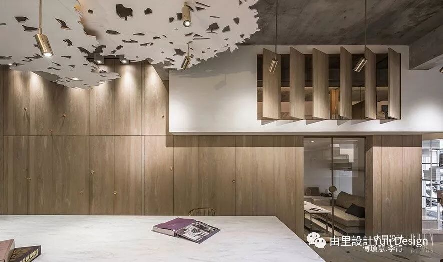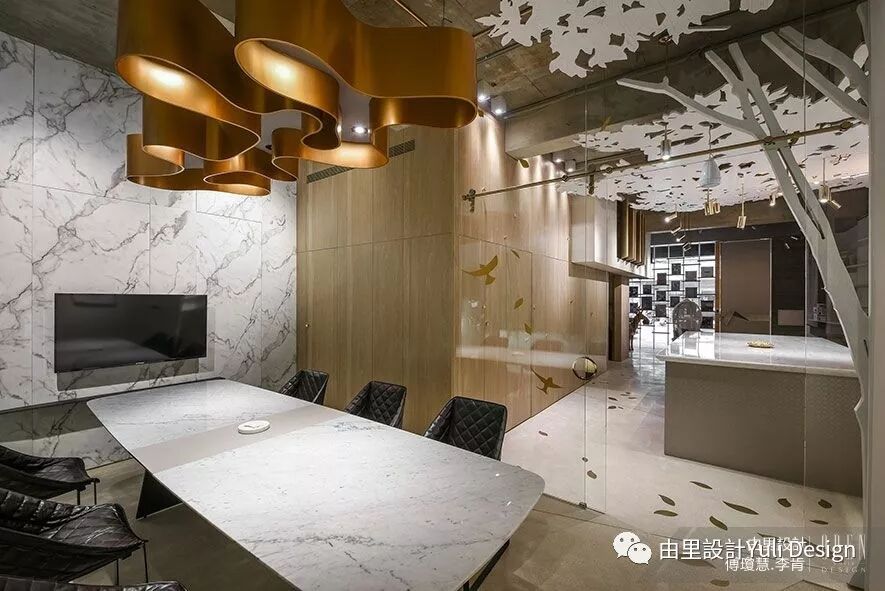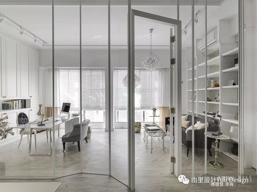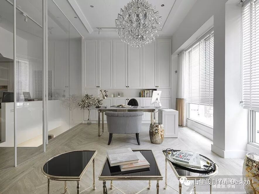 設計師以大面積的長桌和無框玻璃門,翦除場域中的機能界線,既有放大視覺尺度效果,亦能在如家一般的舒適氛圍中,迅速拉近與客戶的距離感。接待會客區與收納櫃融合的巧妙構思,藉此讓整潔劃一的視覺效果展現出來,使空間機能更為實用。透過不同材質的運用及裝置藝術的佈置,成功豐富室內的創意與美學,展現其獨特的藝術涵養。延續大廳的純白意象,二樓利用全白面板及櫃體,提高整體空間明度,帶來清新舒適的視覺感受。大面積的落地窗和清玻隔間,讓充沛的自然光線得環繞於人與空間之中,渲染出通明敞亮的空間延伸感。空間中移除了非必要的裝飾物,還原了空間中最極致的純淨樣貌;精緻的球形水晶吊燈和幾張經典的茶几、沙發,不僅是空間的必然,亦成為美學與機能並行實踐的應然。